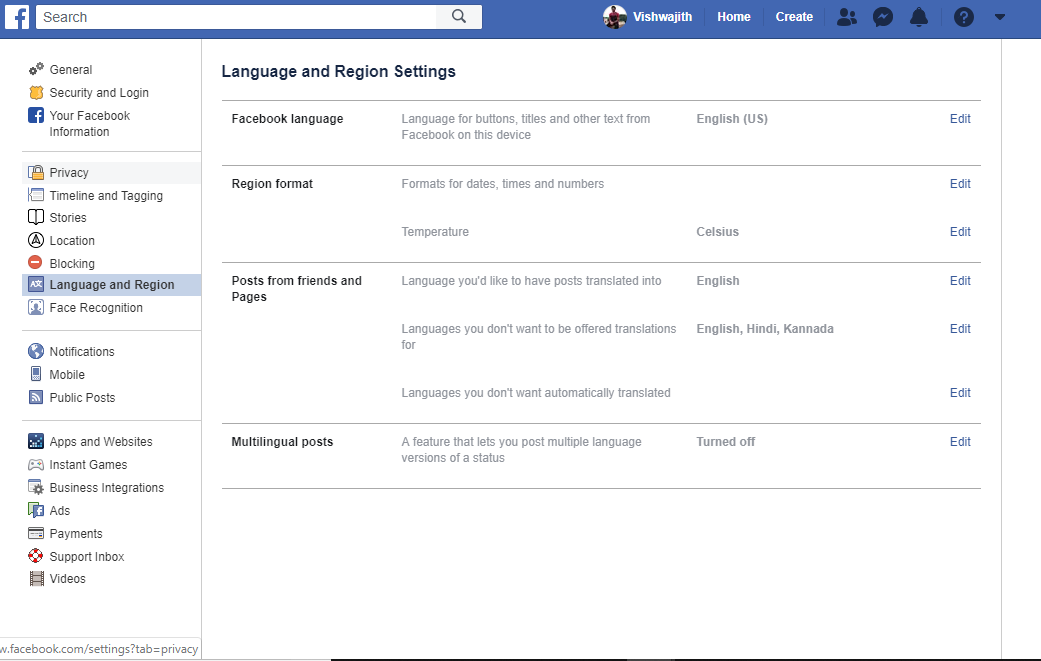 - The first option is Facebook Language. Tap on Edit option and choose the preferred language.