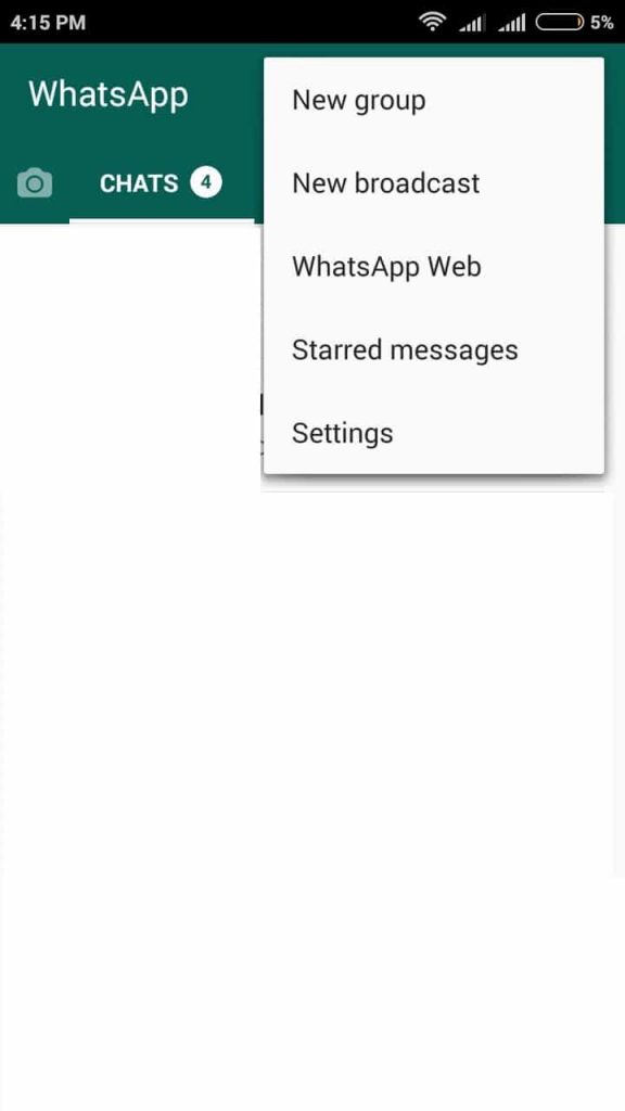 - Open WhatsApp in the smartphone and go to settings( Three verticle dots on the top right of WhatsApp).