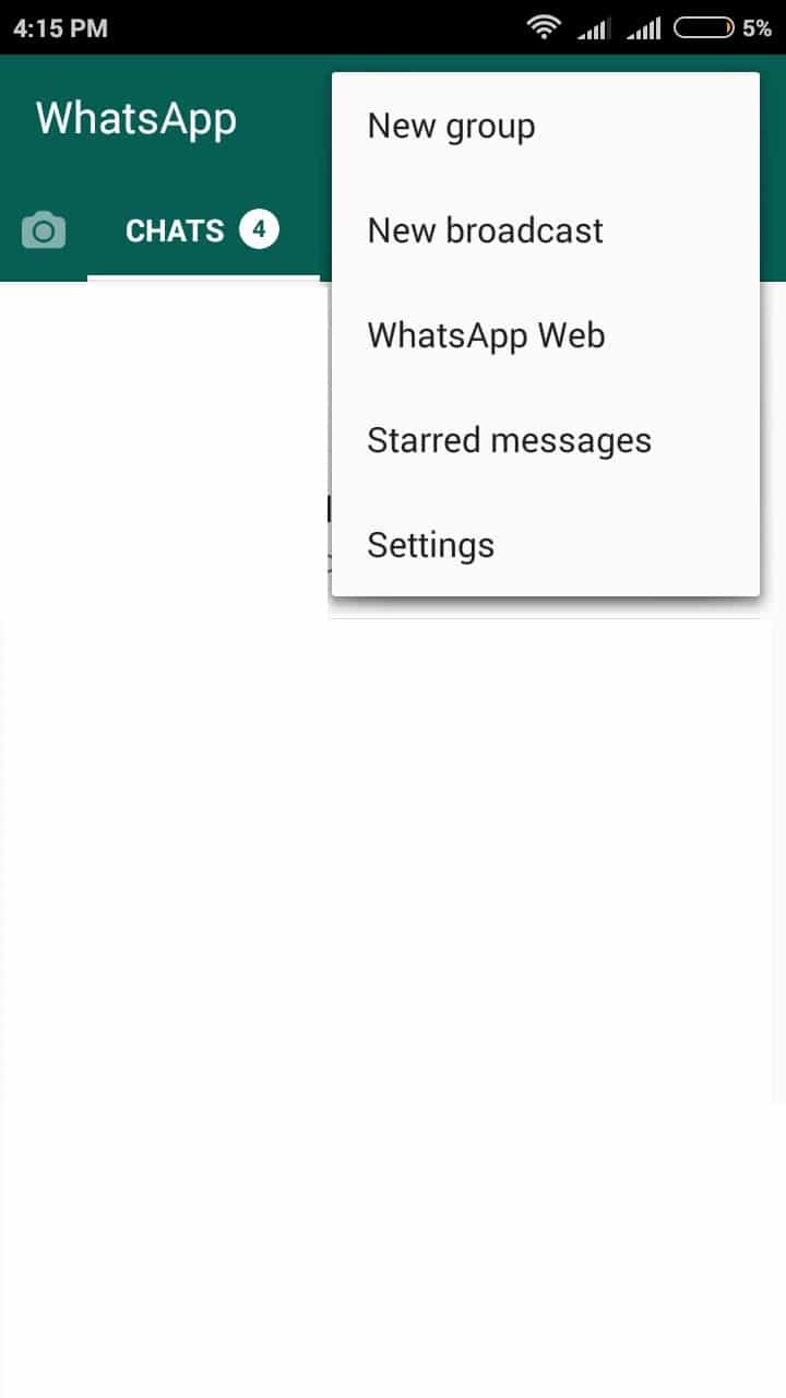 - Open WhatsApp in the smartphone and go to settings( Three verticle dots on the top right of WhatsApp).