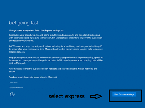 - The computer will get restarted and you will see this screen. Select EXPRESS SETTINGS.