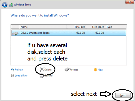 . - Here You will be asked to Select the disk. If you see multiple disks (Partitions). Delete all the partitions by selecting the disk and click delete. Do this for all the disks. You will end up in a single UNALLOCATED disk. (See fig). Click NEXT