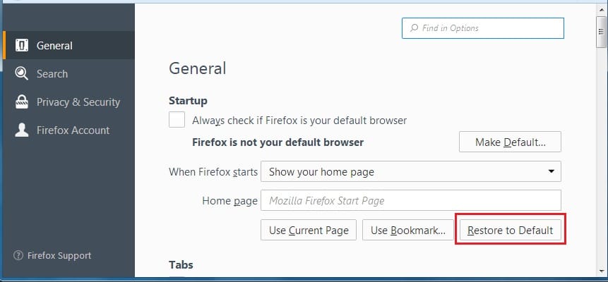 - In the STARTUP section, click RESTORE TO DEFAULT. You can also type the website name or search engine name in the HOMEPAGE field and save.