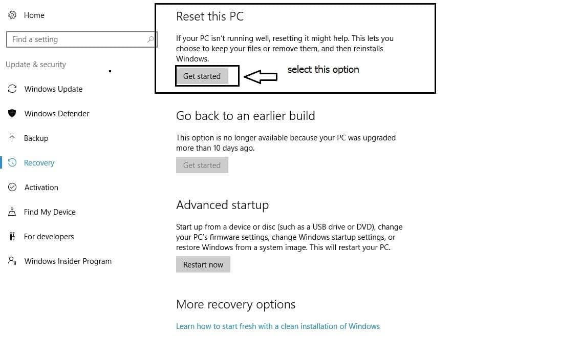 (Last Option in the window) - Click on Recovery (You can see the recovery tab in the left menu list)